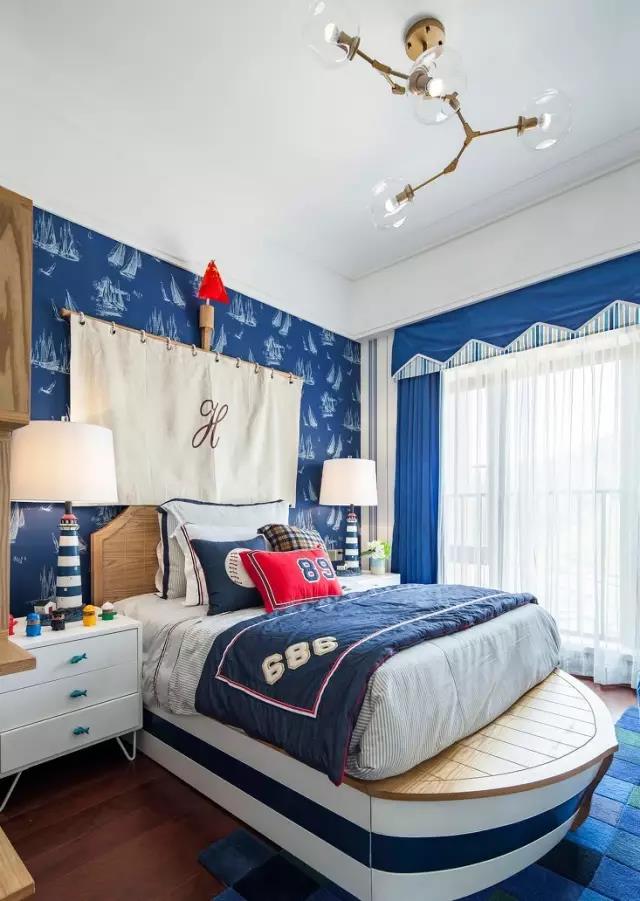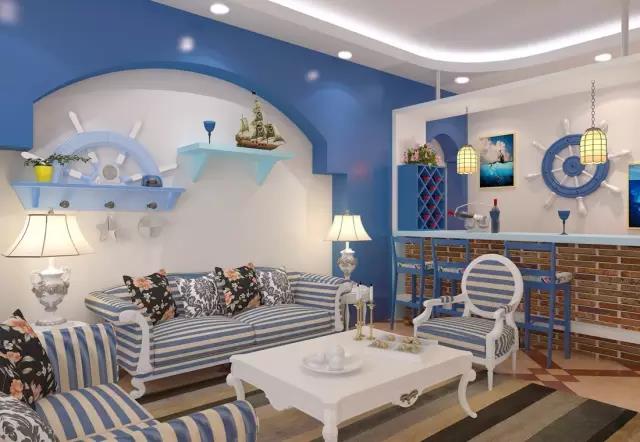大面積的使用藍(lán)色,搭配藍(lán)色的軟裝,海洋元素很豐富。