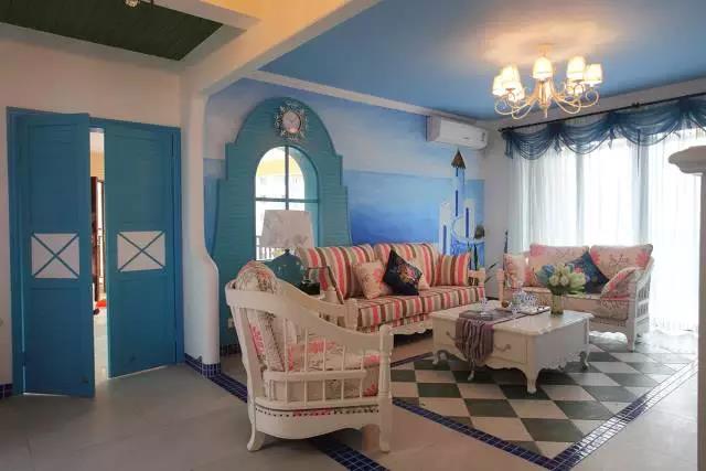 以馬賽克裝飾會(huì)客區(qū)的地面,除了沙發(fā)背景墻元素有點(diǎn)多,白色紗簾藍(lán)色簾頭倒是很出彩。