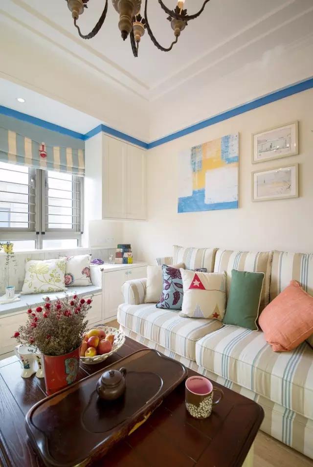 客廳吊頂做了簡(jiǎn)單的石膏線,藍(lán)色的裝飾帶使空間顯得十分靈動(dòng)。