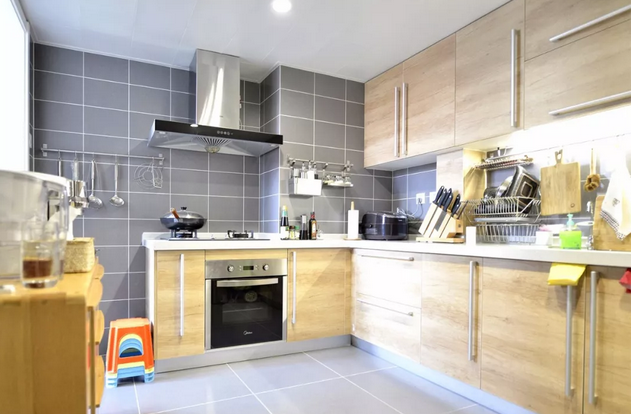 灰色與原木色配搭的廚房廚房的原木色與灰色搭配,定制櫥柜,收納能力驚人,還有一旁的邊柜,放置了料理機,杯子等,取用十分方便,