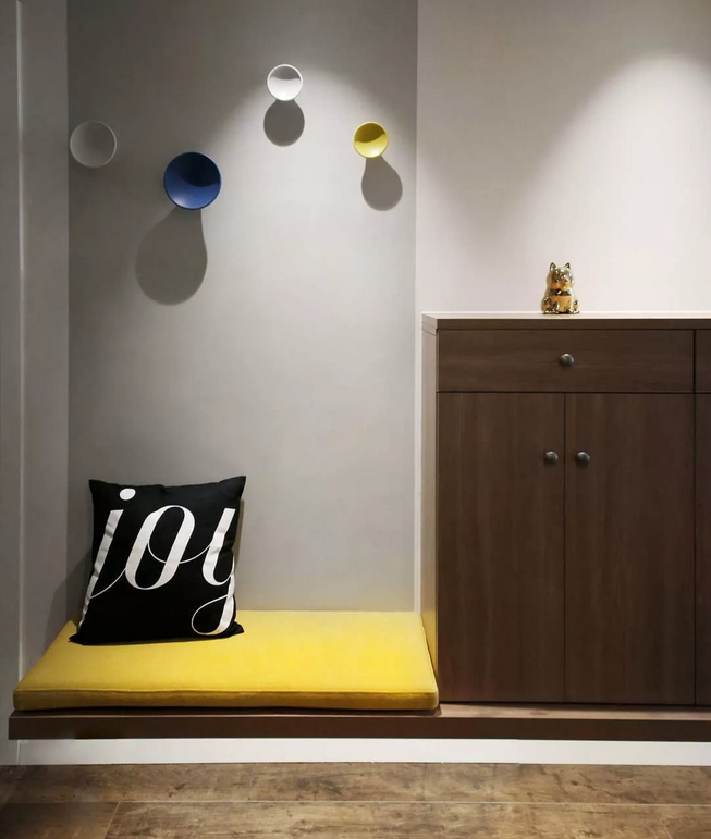 換鞋座與鞋柜都做了掛墻式,沒(méi)有落地柜腳的障礙,掃地擦地順暢很多;由于門廳光線弱,柜體離地也有利于客廳的光線更多的傳遞到門廳。當(dāng)然輔助光源一樣不可少。