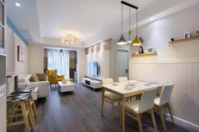 客餐廳的設計上也是非常到位的,客廳采用木質設計減少深色地板帶來的冰冷感覺。