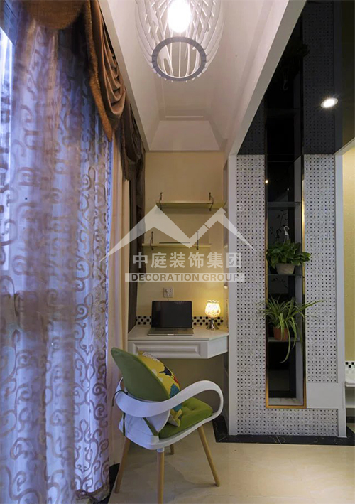 將陽臺用玻璃和木材封閉成居家小書房,窗外的綠葉仿佛伸手可及,好像馬上就會進入居室,自然與居室就這樣在陽臺這個小小空間相交融。為了節(jié)約空間,可將書桌、書架和文件柜都設(shè)計得很小巧別致,既提供了完善的實用功能,又不多占空間。
