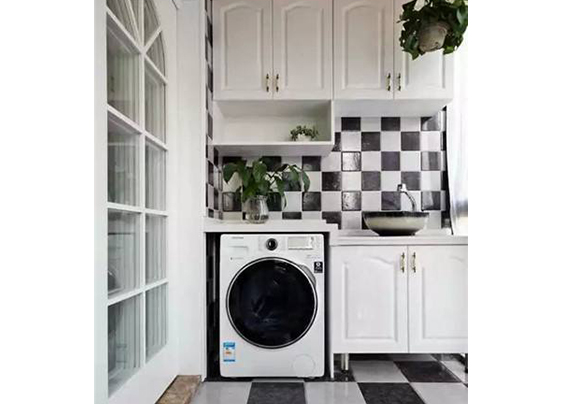 可以選擇把陽(yáng)臺(tái)改成洗衣區(qū),上面有吊頂。是最省錢的,上面還可以儲(chǔ)物,放東西。還有洗手盤,平時(shí)可以洗點(diǎn)衣服這樣。