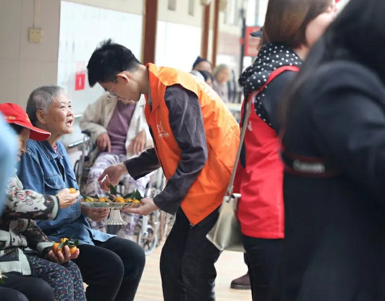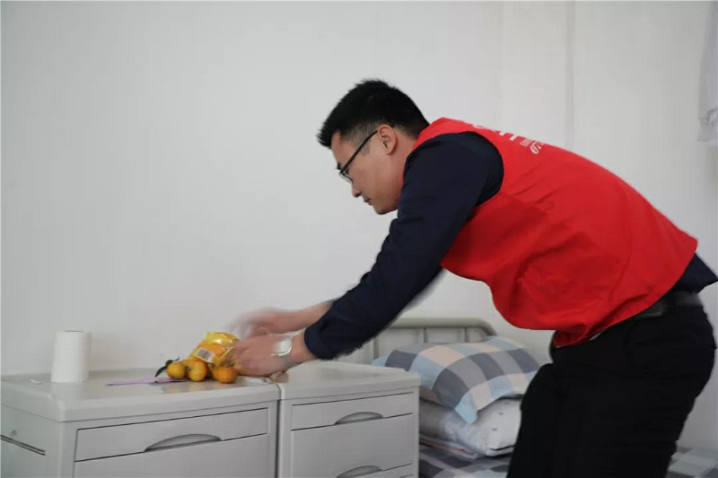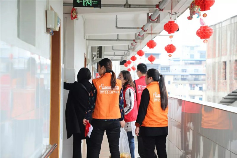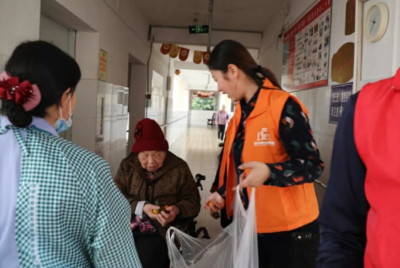 集團家人們帶著水果走訪宿舍,邀請老人們來參加活動;同時也給行動不便不能下樓的老人送去水果,關懷老人。
