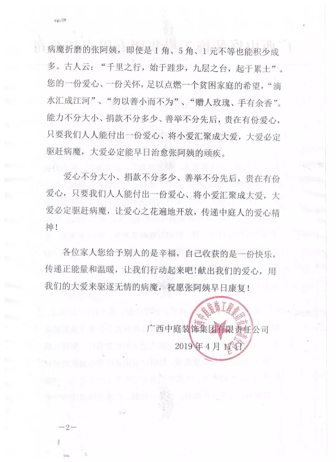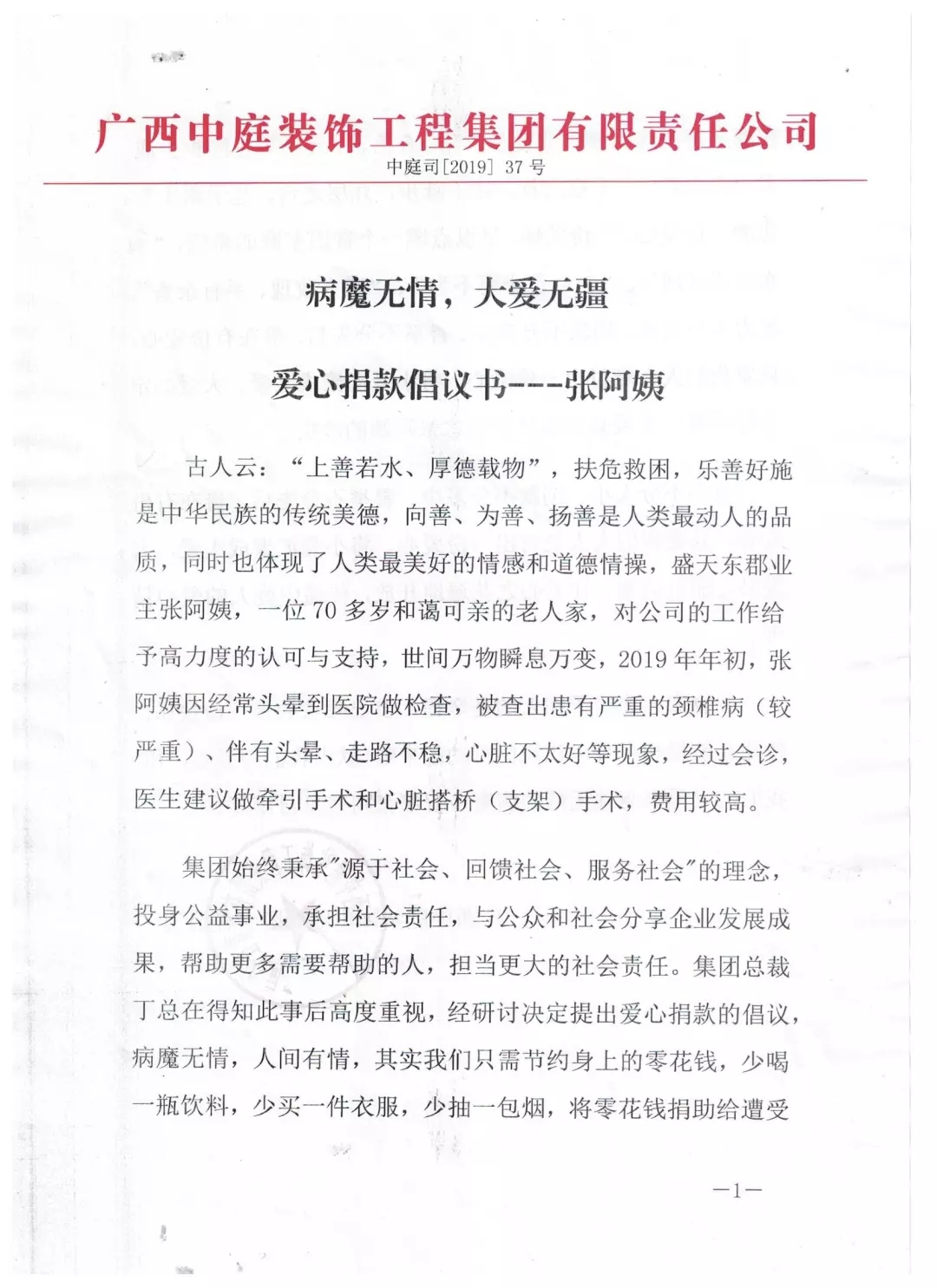 集團(tuán)總裁丁胡先生向全體員工號(hào)召,為張阿姨獻(xiàn)出一份愛(ài)心。捐款不分多少,貴在有份愛(ài)心,只要我們?nèi)巳硕寄芨冻鲆稽c(diǎn)愛(ài)、將小愛(ài)匯聚成大愛(ài),大愛(ài)必定驅(qū)趕病魔,大愛(ài)定能早日治愈張阿姨的疾病。