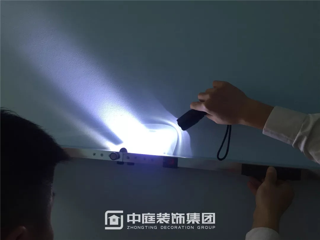 使用強(qiáng)光手電檢查墻面膩?zhàn)邮┕な欠襁_(dá)標(biāo)