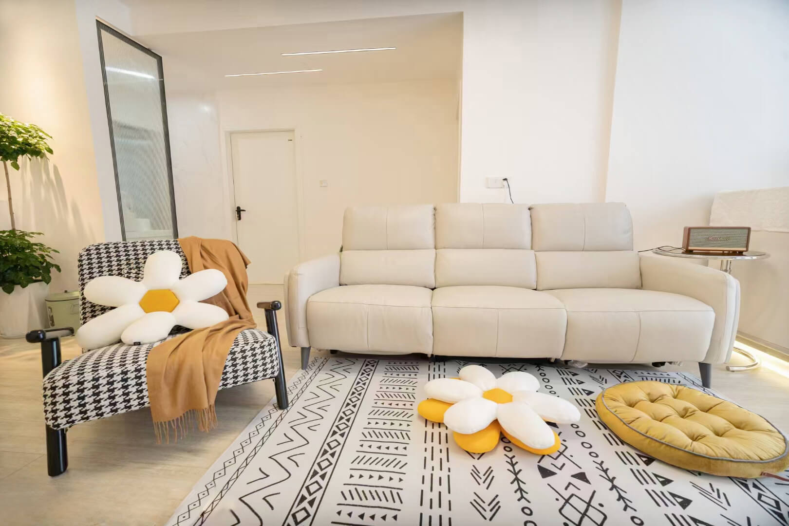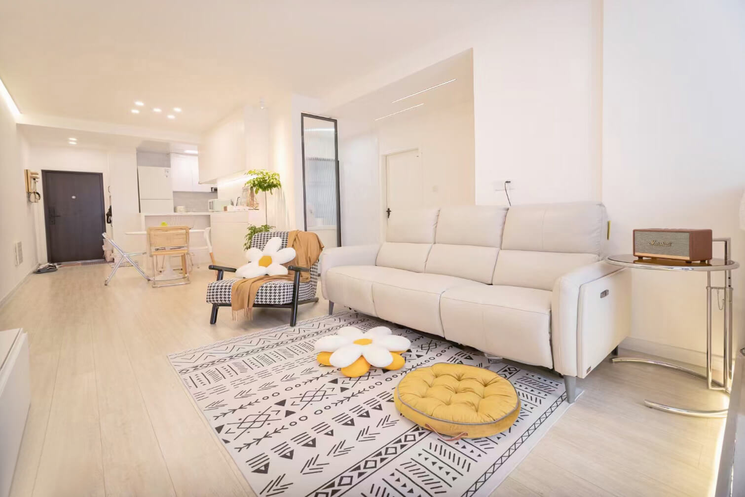 本案總面積85㎡。設(shè)計(jì)師以簡約的表現(xiàn)形式來滿足業(yè)主對于簡約卻不簡單的居室環(huán)境的要求。整體選擇白色為主色調(diào),再以明快的黃色、橙色作為點(diǎn)綴,為業(yè)主提供一個(gè)簡單、自然的生活環(huán)境。