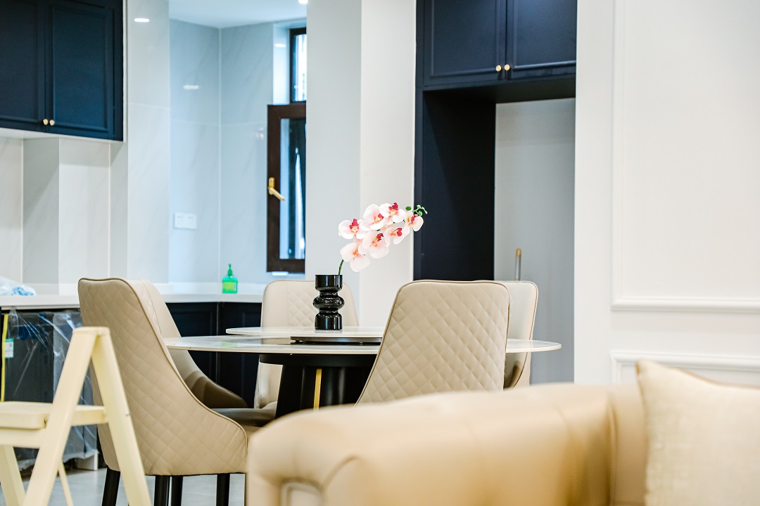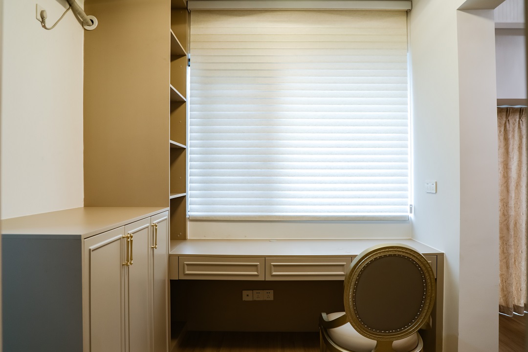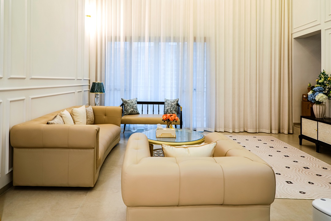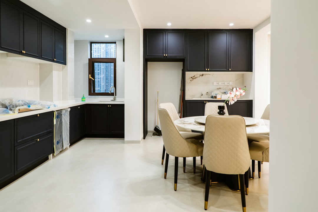 乳白色布藝沙發(fā)與黑色復古腳凳沙發(fā)的搭配,用智能窗簾隨時打開好心情,從客廳往廚房看去,用復古法式弧形帶出了精致有趣的視角