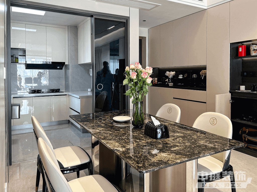 餐廳:開放廚房與餐廳結(jié)合,形成餐、廚一體空間。所有廚房電器嵌入式設計,并按照業(yè)主烹飪習慣布置,保證操作動線便捷、合理。