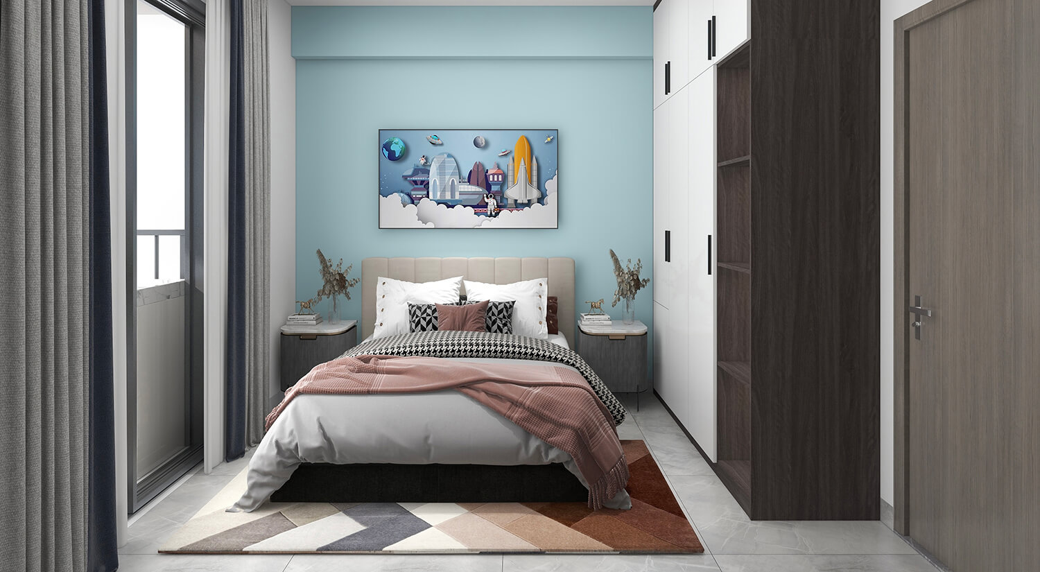 本案例戶型為:3房1廳1衛(wèi),總面積99㎡。在房間的布局上,現(xiàn)代簡(jiǎn)約風(fēng)格強(qiáng)調(diào)實(shí)用性和舒適感。布局簡(jiǎn)潔明了,避免過多的家具和裝飾品,力求創(chuàng)造出整潔、明亮和開放的空間感。