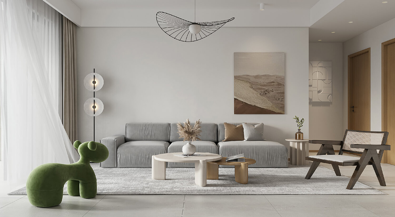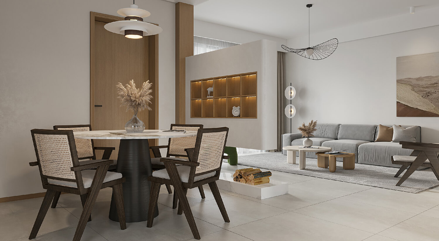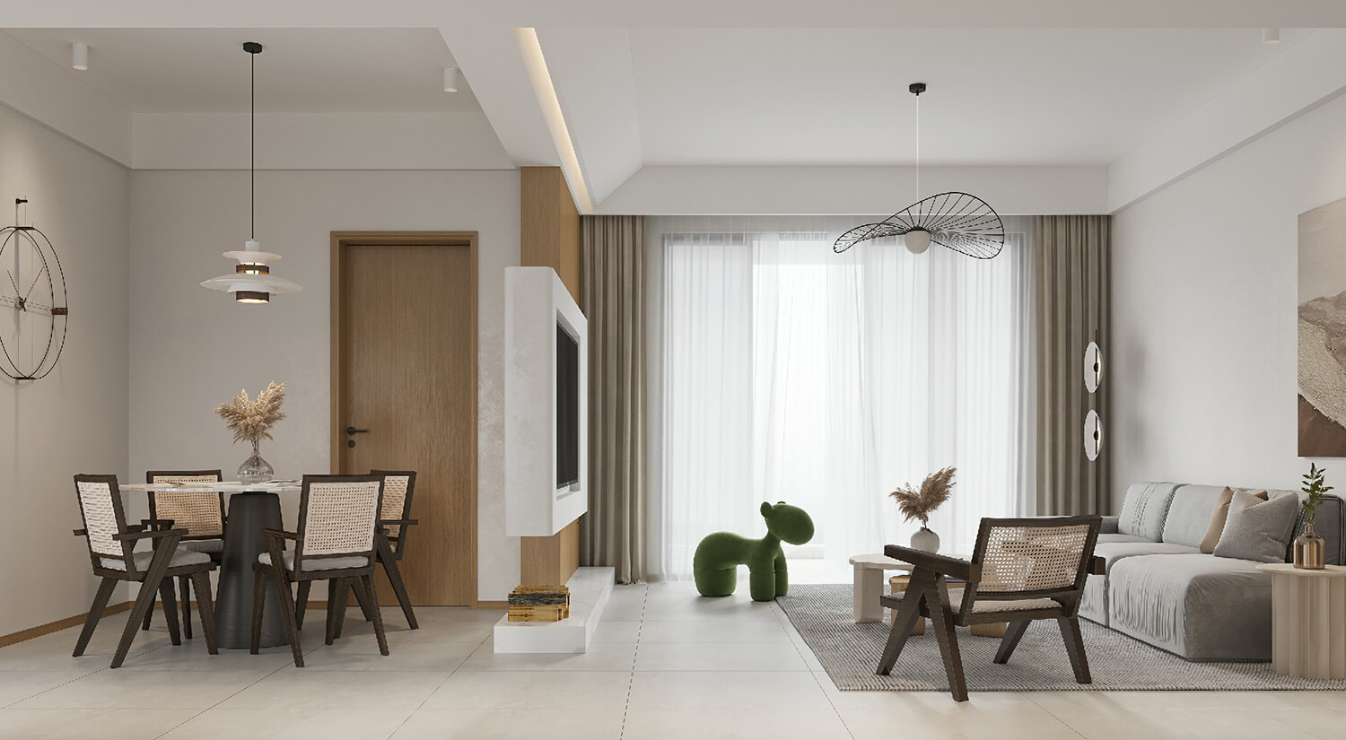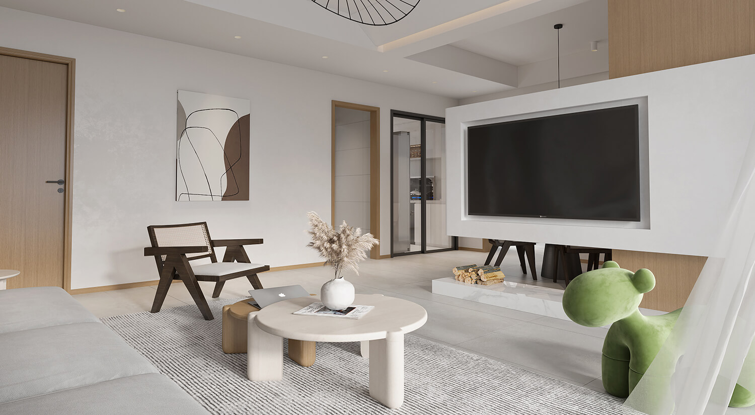 本案屬于現(xiàn)代簡約風格??蛷d采用無主燈設計,更具簡約時尚感??筒蛷d布局合理,客餐廳通鋪淺灰色瓷磚。使空間更加開闊明亮,增加空間美觀度。