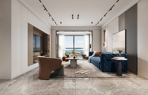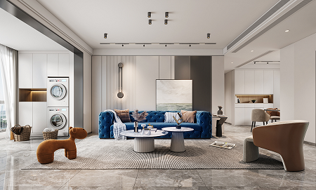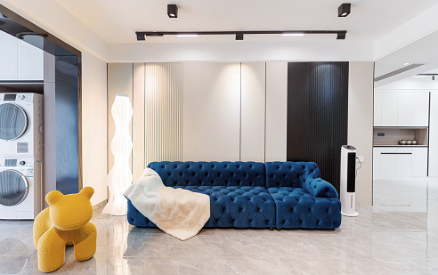 使用更親近自然的棉、麻、木搭配黑、棕、白、灰色,在裝飾上極度的克制,給人高品質(zhì),舒服的感受。削弱復(fù)雜造型和色彩對(duì)人情緒的影響,反而產(chǎn)生了治愈的力量??巳R因藍(lán)沙發(fā)的點(diǎn)睛之筆,顯得整個(gè)空間更加自信,給人傳遞高級(jí)的視覺(jué)感受。