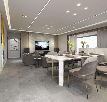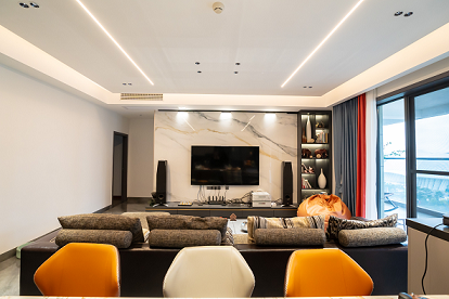 電視背景墻選用木飾面及巖板,質(zhì)感柔和,地面用同色系深色些的瓷磚,讓空間更有層次感。