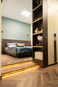 在臥室的臺(tái)階處制作地臺(tái),加燈帶氛圍烘托氣氛,做柜子有效隔開衣帽間獨(dú)立空間。